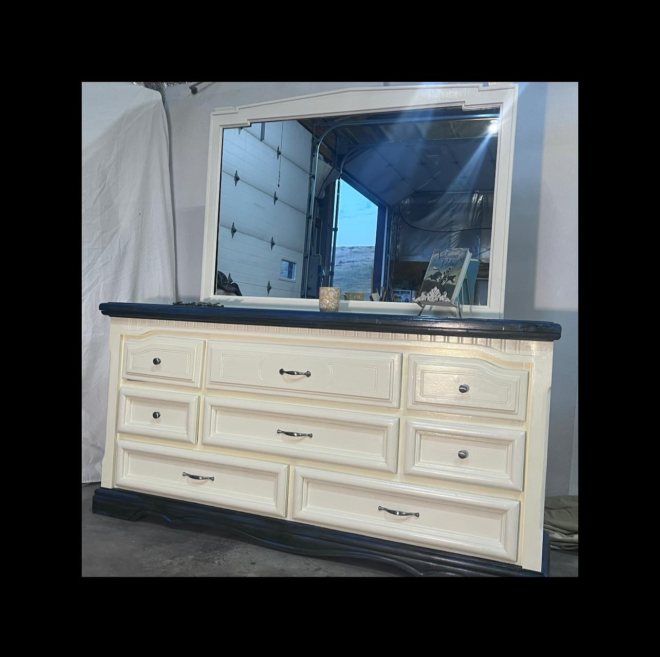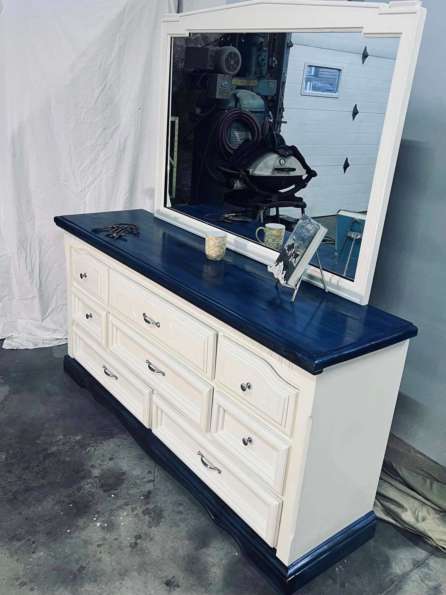 Breathe fresh life into your bedroom with this substantial 8-drawer dresser and matching mirror. This piece has been beautifully reimagined with a sophisticated two-tone finish. The body and mirror frame are painted in a crisp, creamy antique white, while the tabletop and base are finished in a deep, contrasting deep blue & navy , giving it a grounded, elegant look. Made by hand and perfectly refinished.