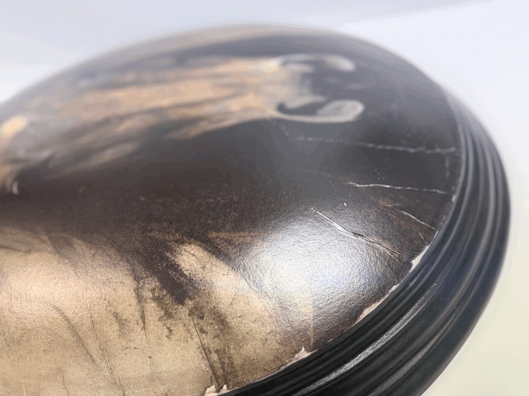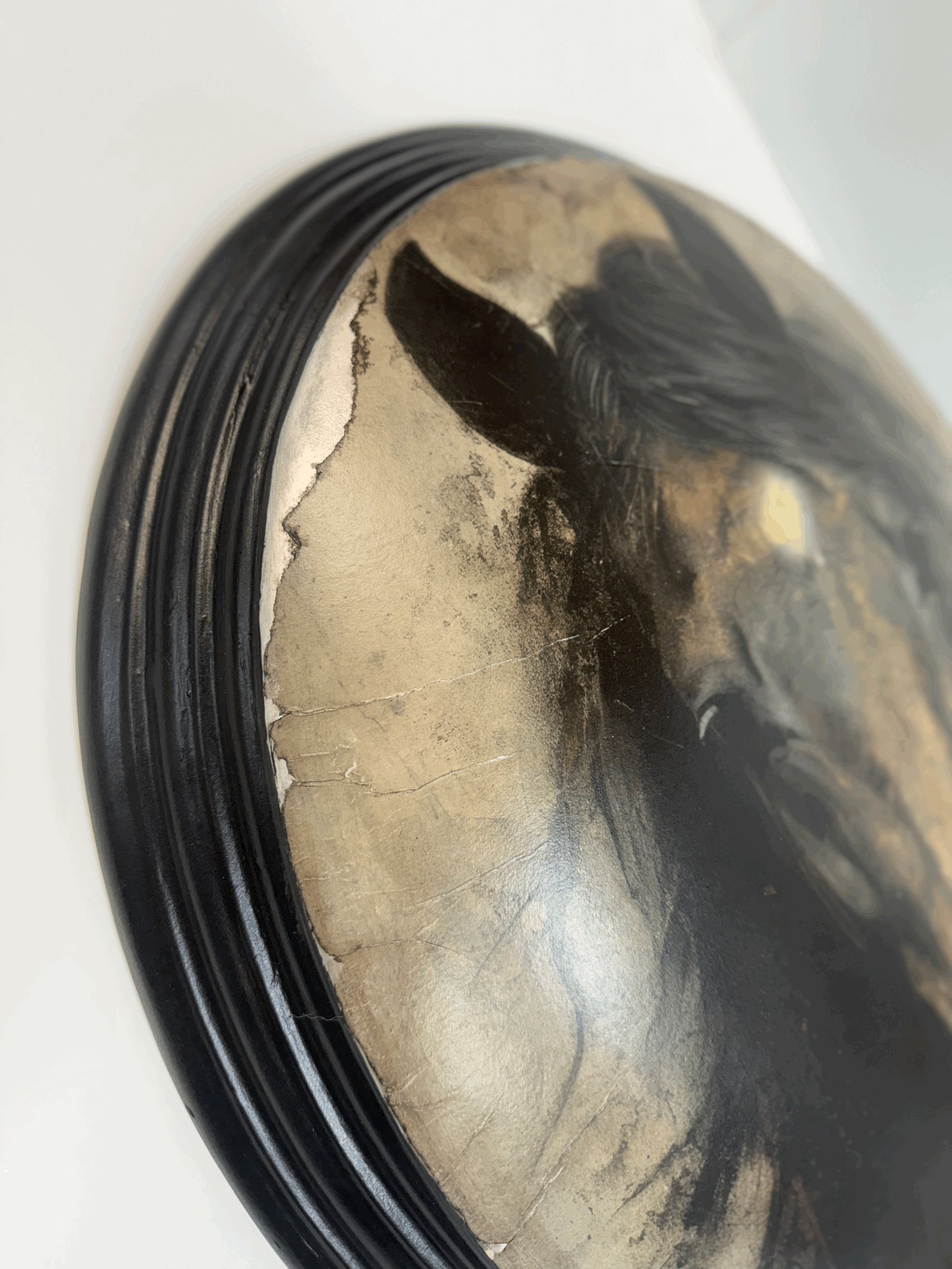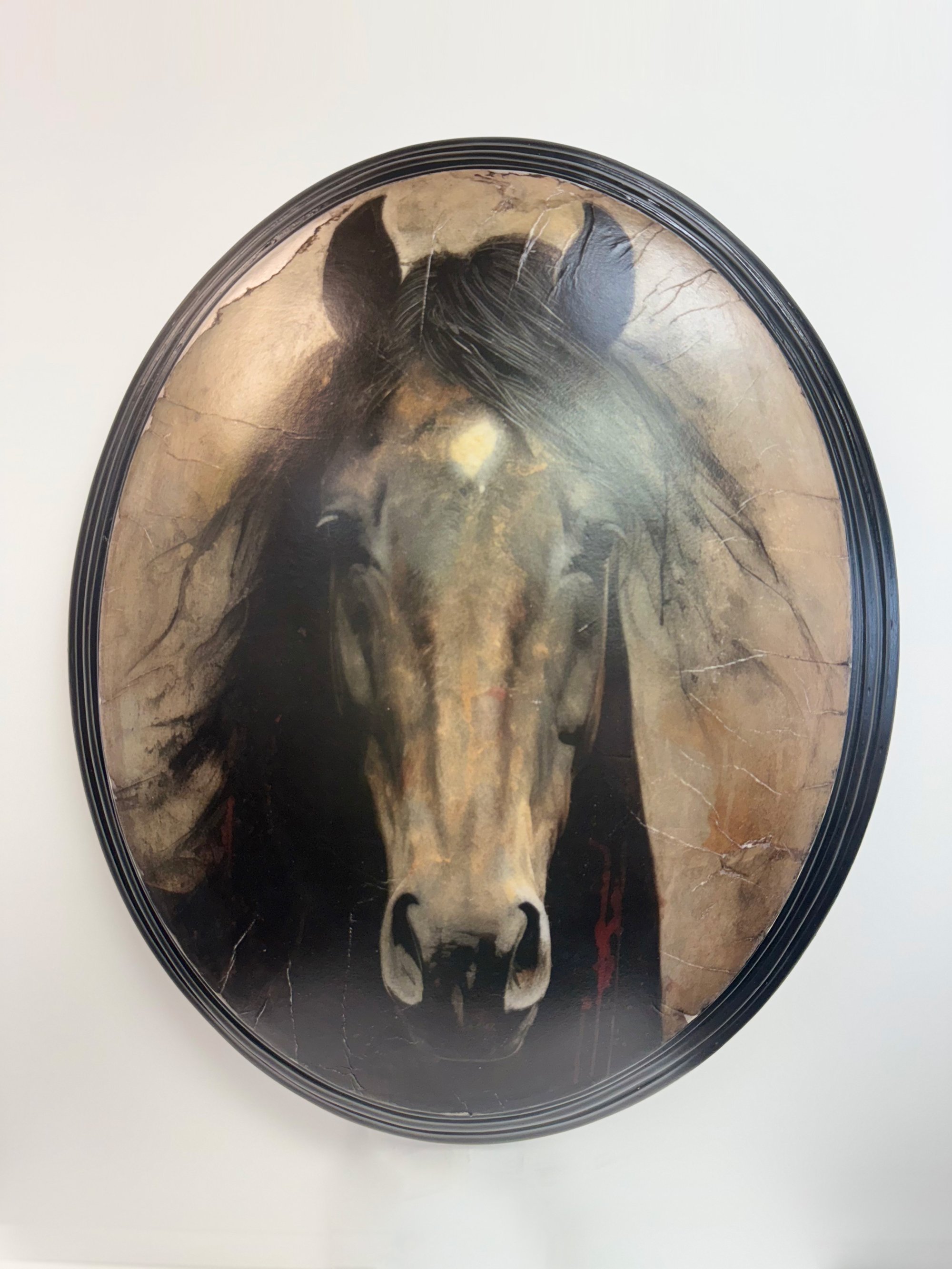 Add a touch of soulful elegance to your home with this moody equestrian wall art. This piece is a close-up portrait of a stunning, distressed, vintage-looking horse with decoupage. It is designed with a heavy crackle texture to mimic the appearance of an old masterpiece. Ask about the hidden feature, it's too good to advertise here. Decoupage, Silver & Chalk Painted with warm stained edge. Satin Finish. 23"T x 19"W x 3.5"D