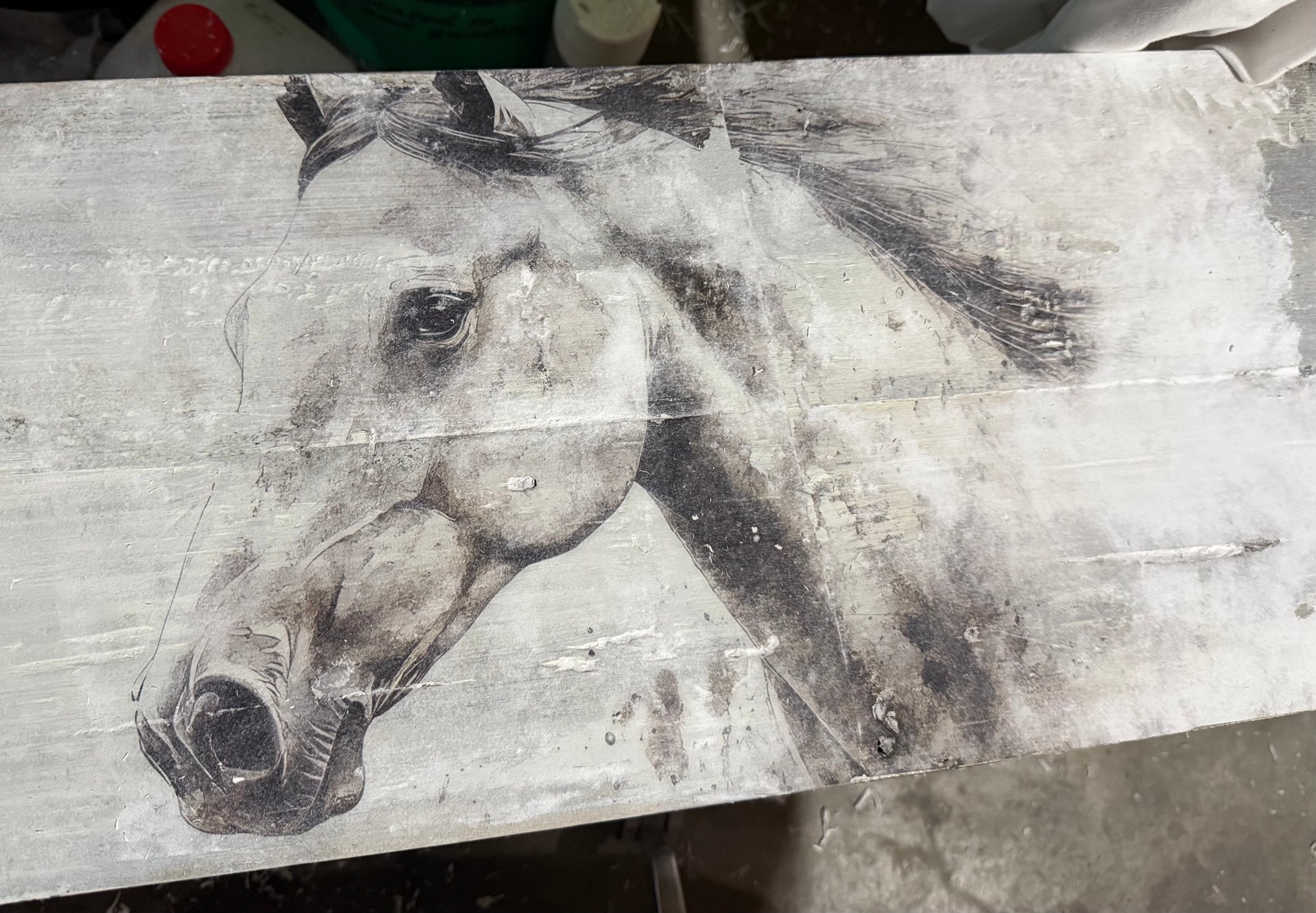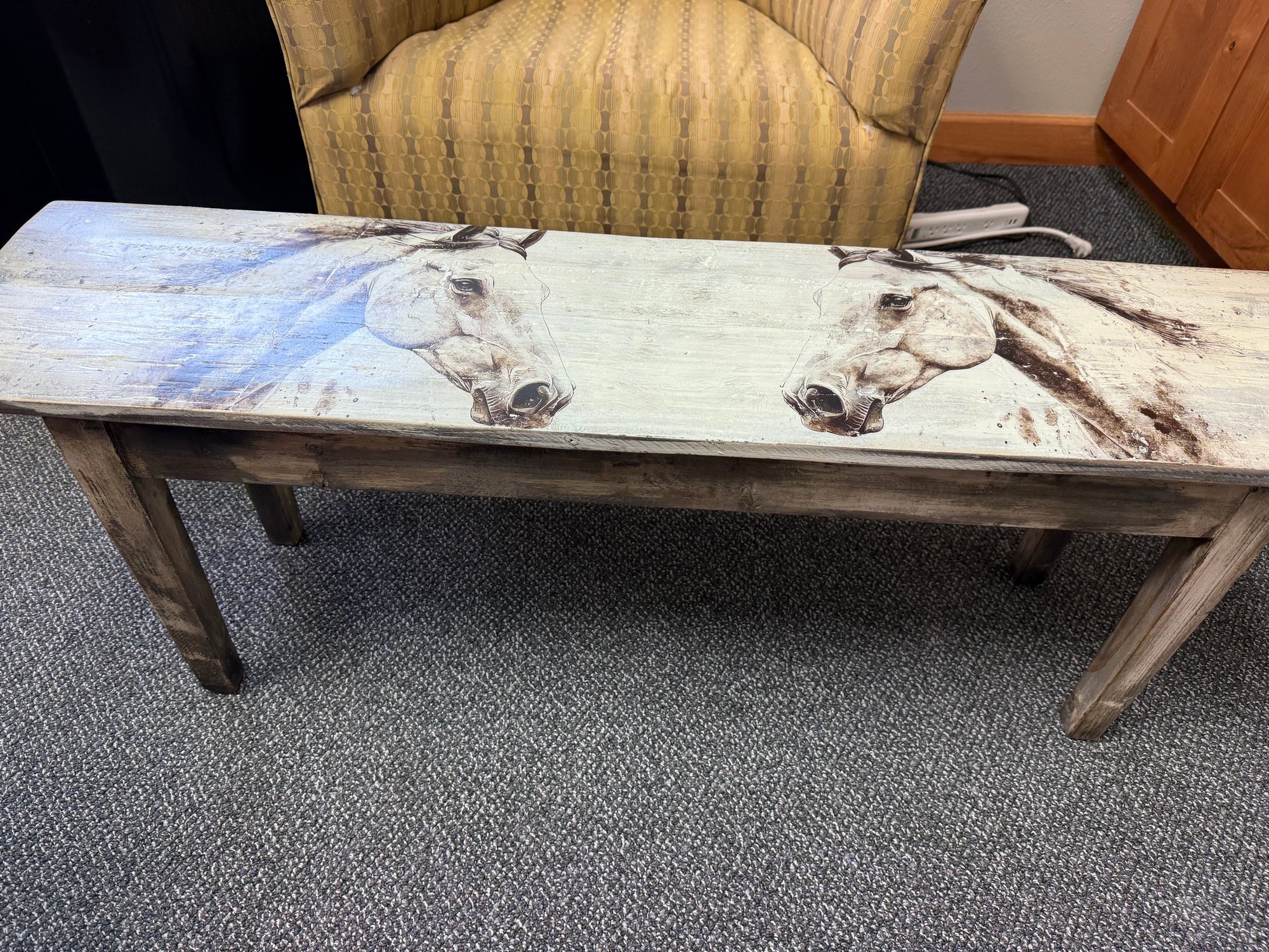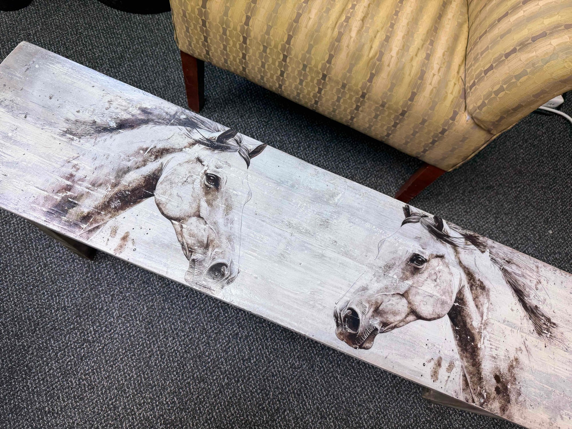 The standout feature is the artwork: two detailed, pencil-sketch style horse portraits facing each other from opposite ends of the bench. The art is seamlessly integrated into the wood grain, giving it a soft, ghostly, and artistic appearance.