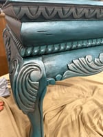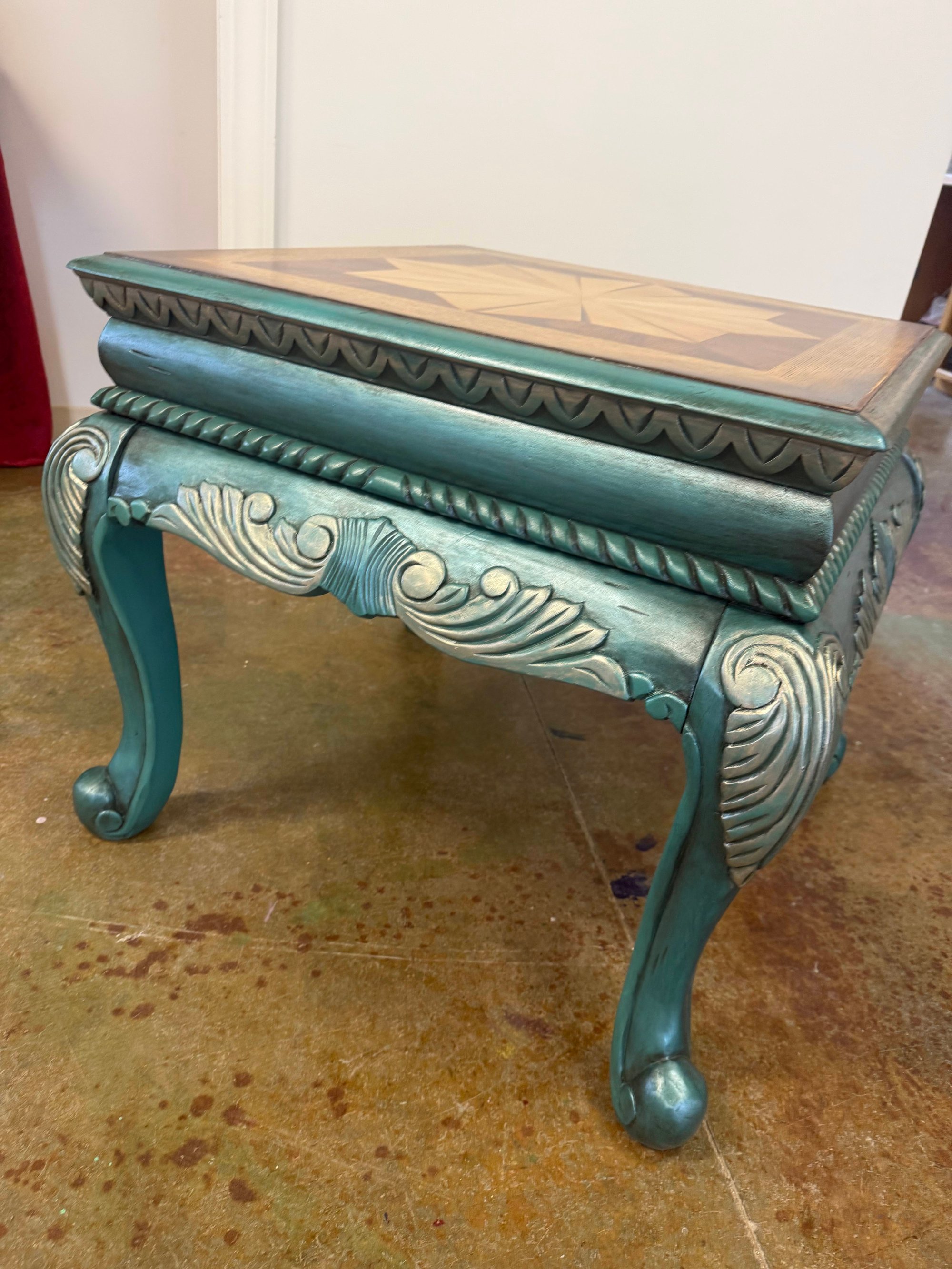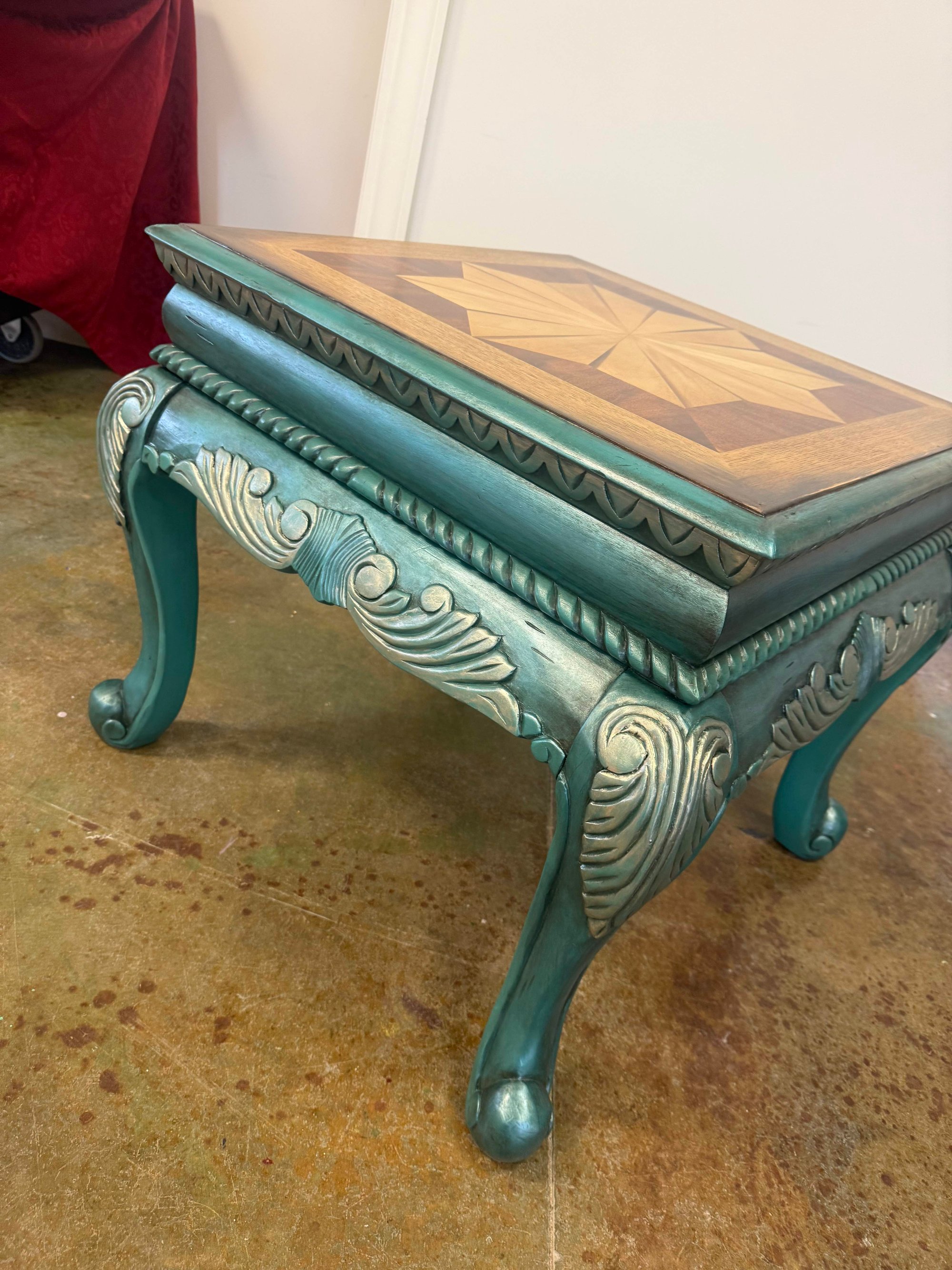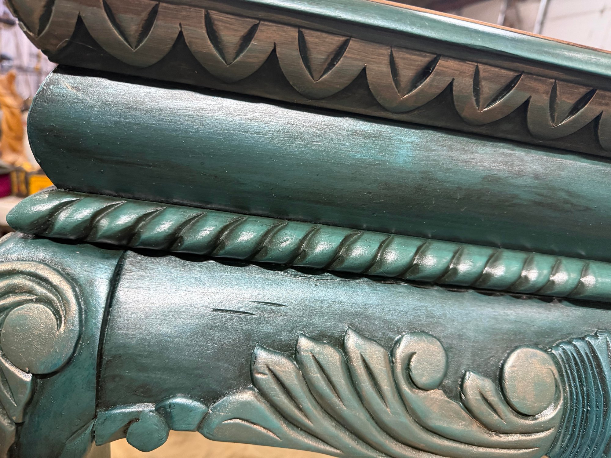 The base has been transformed with a rich, metallic teal finish. The intricate details—including the rope trim, deep acanthus leaf carvings, and cabriole legs—are accentuated with gold gilding, making the texture pop. Whether used as a bedside nightstand or a living room end table, this piece is pure maximalist charm.