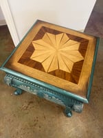 Add a touch of whimsical elegance to your room with this stunning refinished side table. This piece perfectly balances traditional craftsmanship with modern, artistic flair. The tabletop features gorgeous wood marquetry (inlay) in a geometric starburst pattern, preserved in its natural wood tones to showcase the grain.