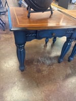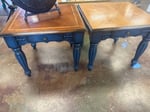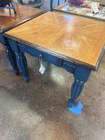 Nearly Matching end tables with drawers. Add sophistication to your bedroom or living room with this matching pair of vintage end tables. These sturdy wood tables have been professionally refinished in a deep, midnight navy blue, providing a stunning contrast against the natural stained wood tops.