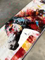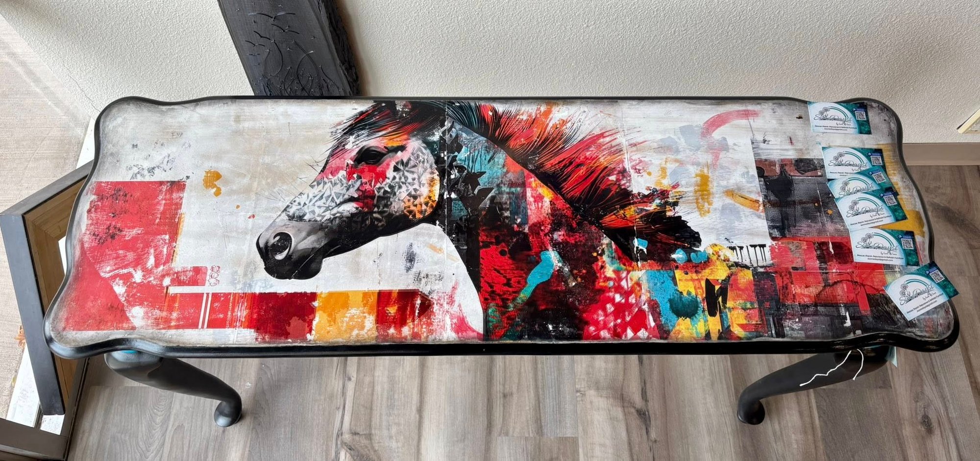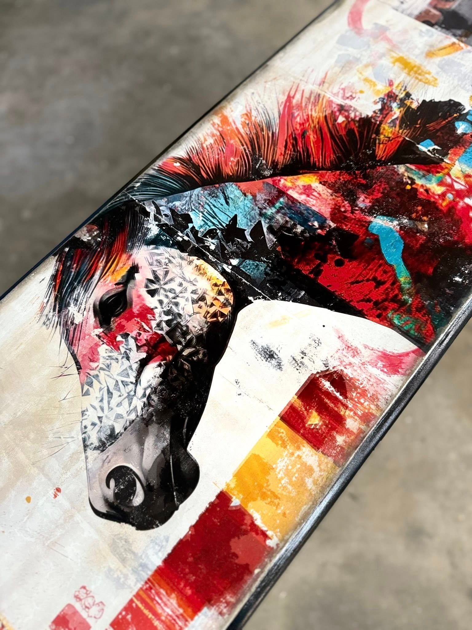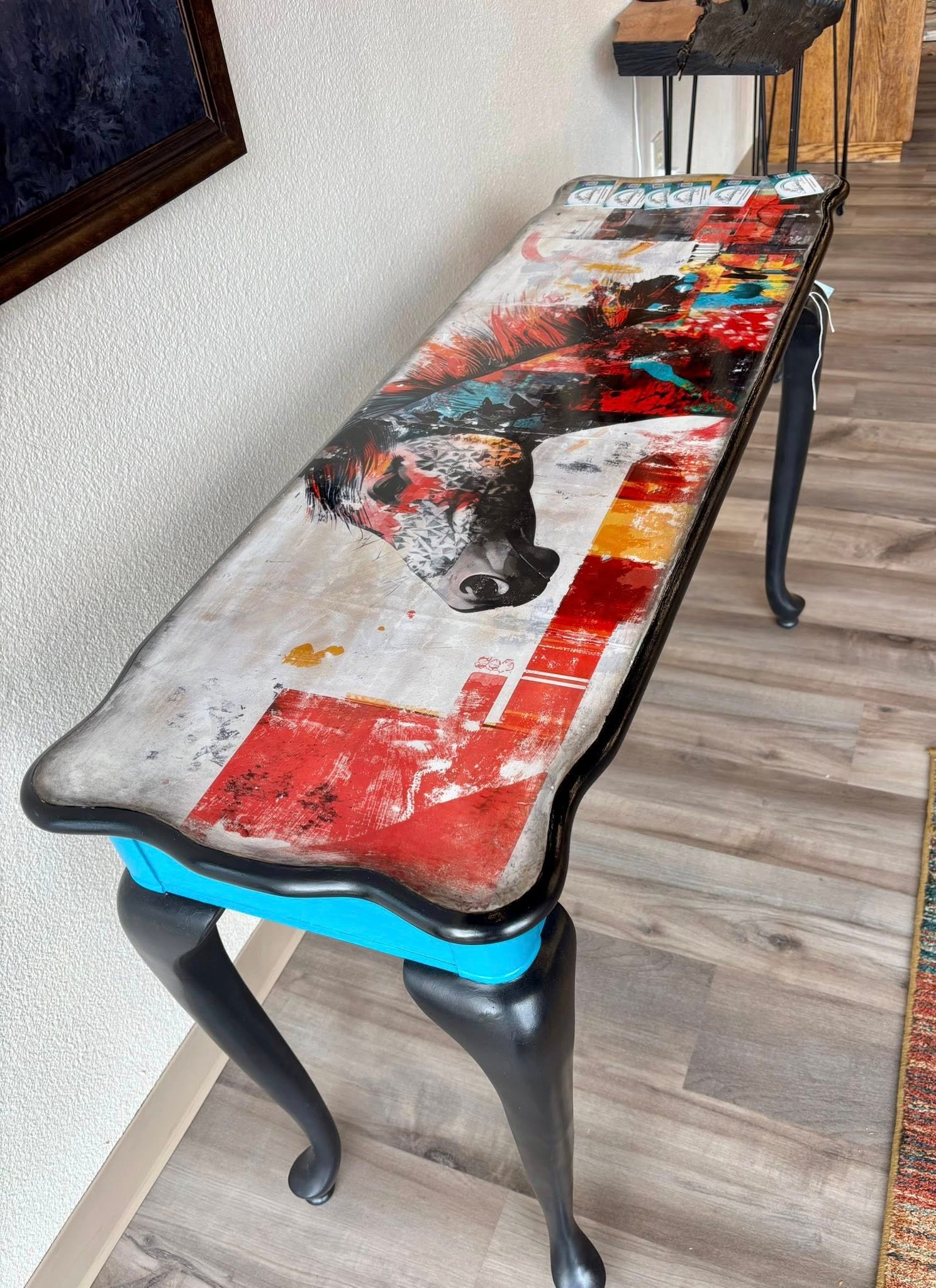 The true focal point is the tabletop, which features a striking, mixed-media style art print of a horse. The design blends grunge textures, geometric patterns, and splashes of red, orange, and teal against a distressed background. Whether placed as a sofa table in your living room or a hallway table in your entryway, this slim-profile piece is functional art that demands attention.