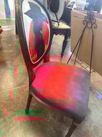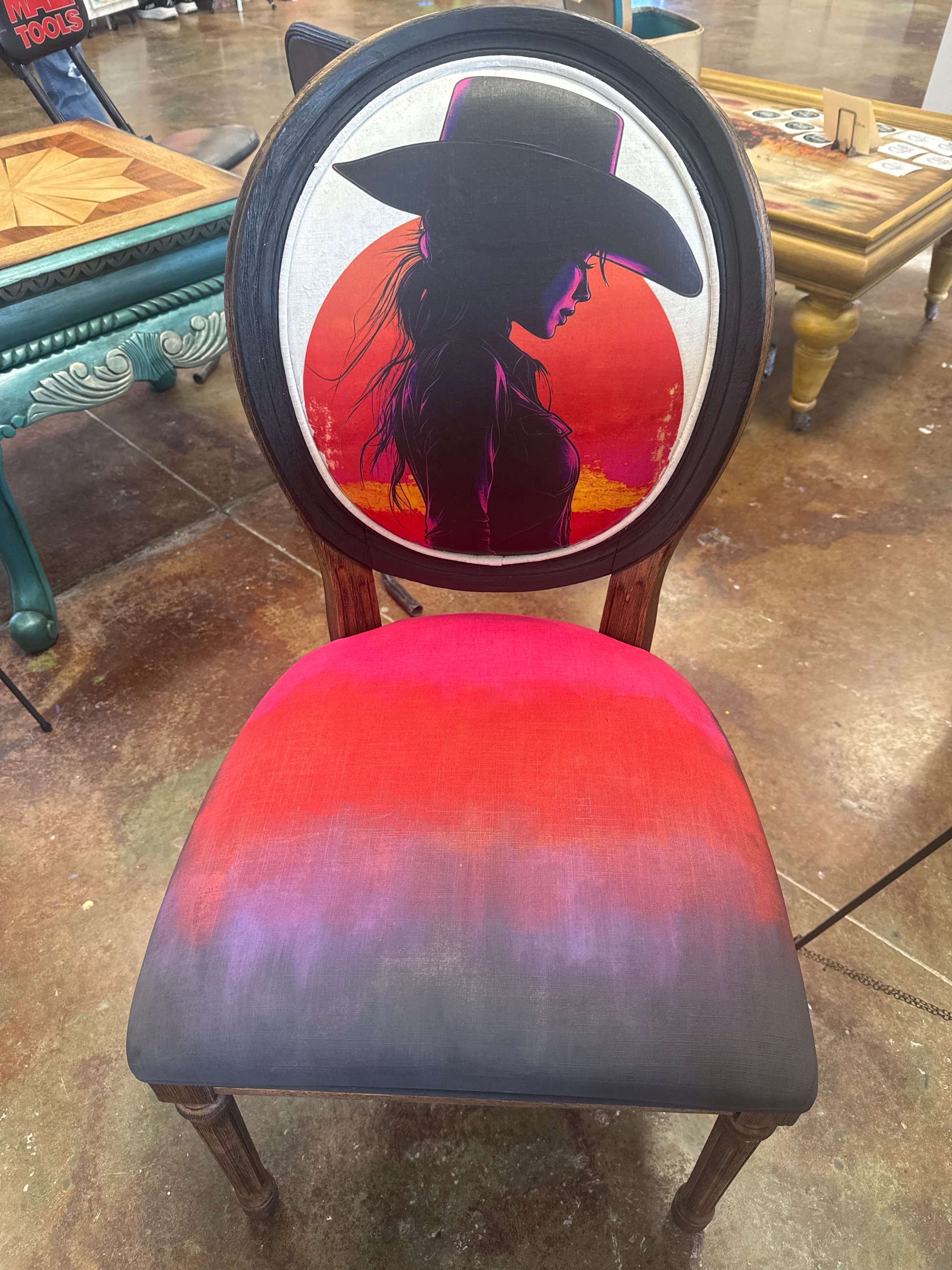 Featuring a stunning graphic back of a cowgirl silhouette against a blazing red sun, this piece captures the mystery and beauty of the West. Set in a classic, distressed dark wood frame, this chair strikes the perfect balance between vintage charm and modern edge. It’s perfect for a boho living room, a creative studio, or as the standout piece in a western-chic bedroom.